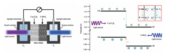 针对这一难题,研究团队依托功能无机材料化学教育部重点实验室,成功设计并制备了基于能带结构匹配的二维半导体纳米片纳流体器件,该器件展现出Ⅱ型异质结结构特征。其独特的非对称通道结构以及优化的表面电荷分布策略,显著降低了浓差极化效应的影响。同时,研究通过构建高效的半导体异质结,实现连续的电子—空穴对分离,进而产生内建电场,有效减缓跨膜电势的降低,促进“光—电—离子”转换过程连续性。在光照条件下,该器件在等渗溶液中展现出2.55μAcm⎺²光电流输出性能,有效利用光能促进离子跨膜传输。尤为重要的是,该器件盐差转换输出功率密度达到890Wm⎺²。这一创新设计为实现光能、渗透能等清洁能源综合高效利用提供了切实可行的途径。